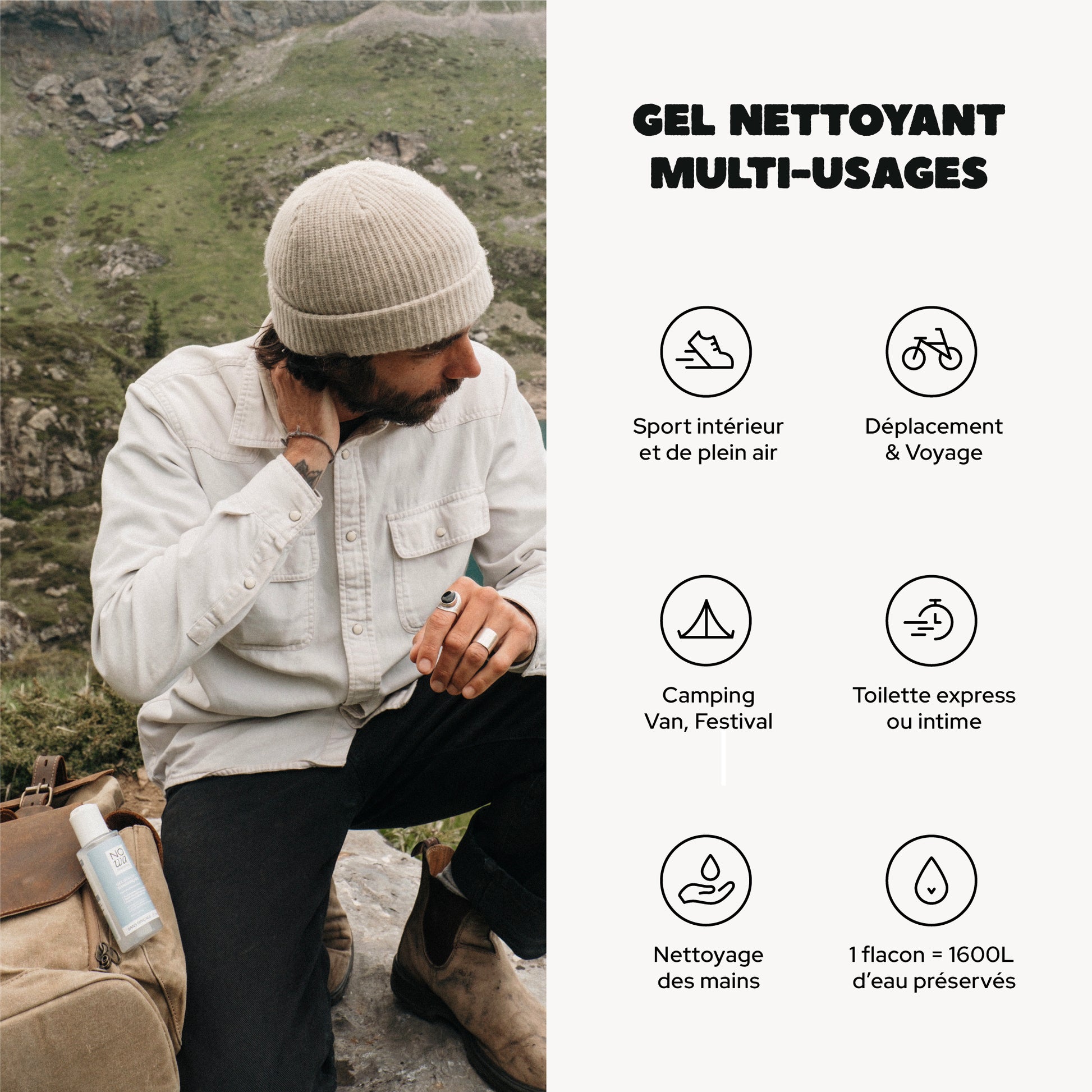 Sport en salle, sport en plein air, randonnée, déplacement, voyage, camping, bivouac, van, festival, nautisme, coup de chaleur, rafraîchissement avant un rendez-vous, ou avant une soirée, toilette intime, toilette express, handicap empêchant un accès facile à la douche...